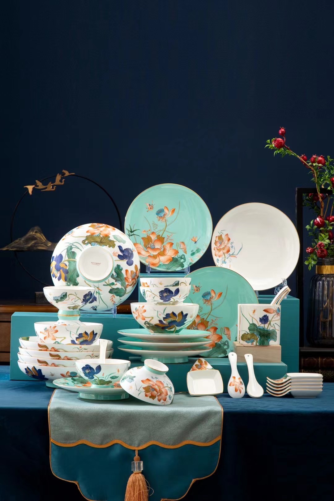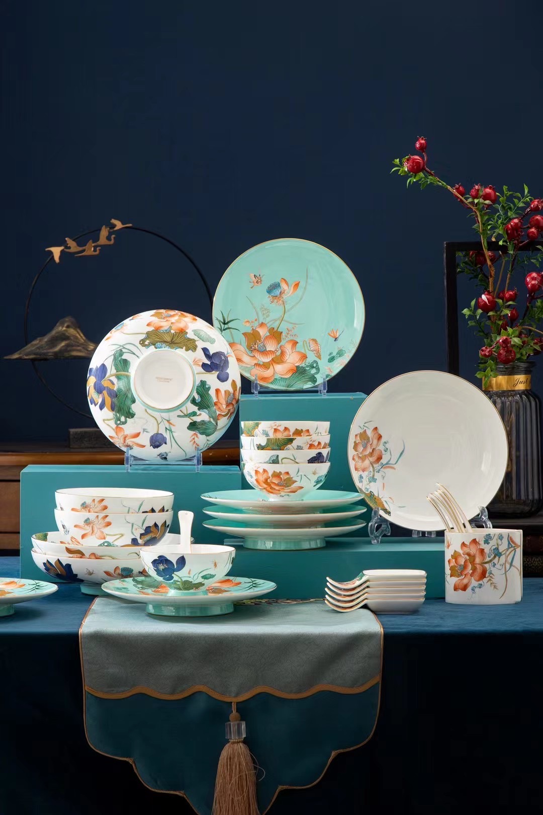 粉彩荷花多頭陶瓷餐具套裝